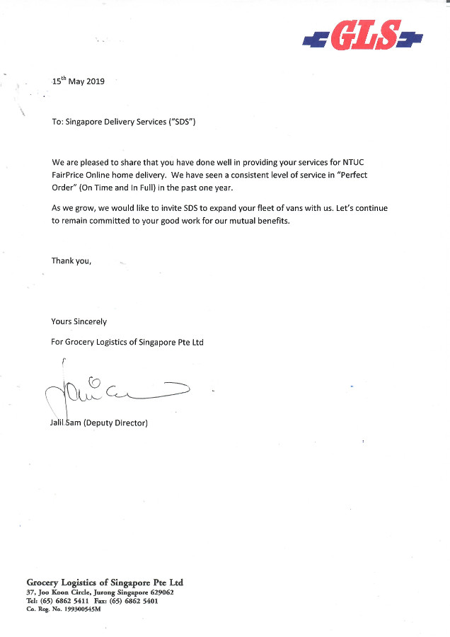 We are pleased to share that you have done well in providing your services for NTUC FairPrice Online home delivery. We have seen a consistent level of service in “Perfect Order” (On Time & In Full) in the past one year. As we grow, we would like to invite STS to expand your fleet of vans with us.Let’s continue to remain committed to your good work for our mutual benefits.